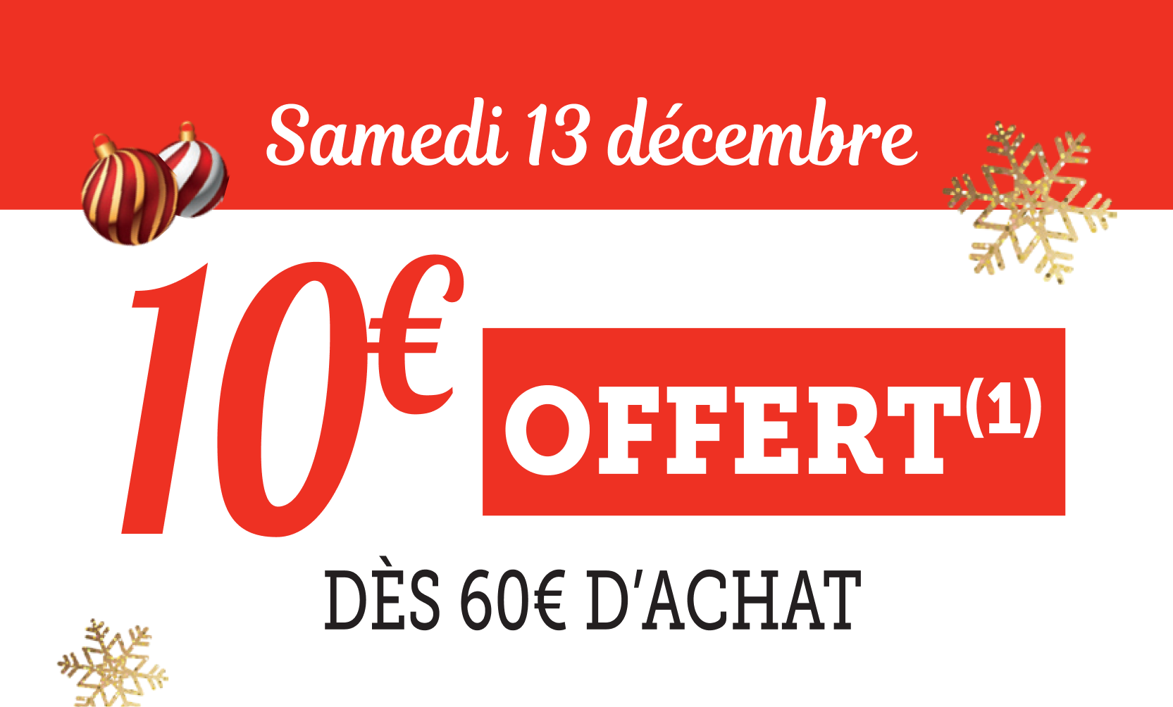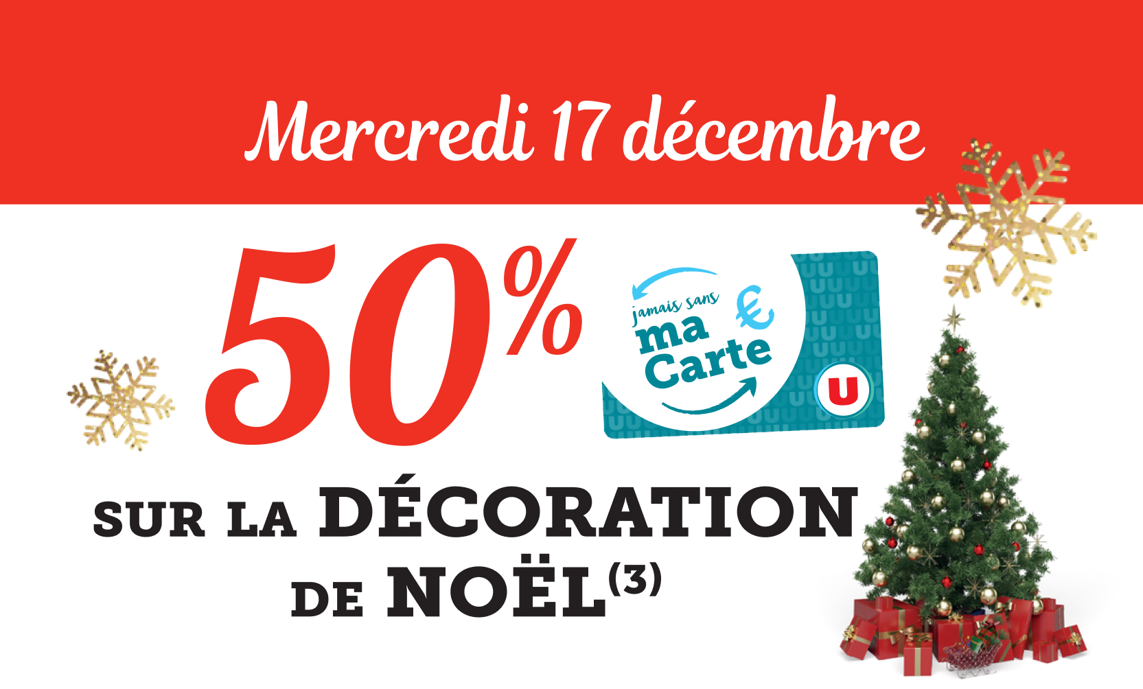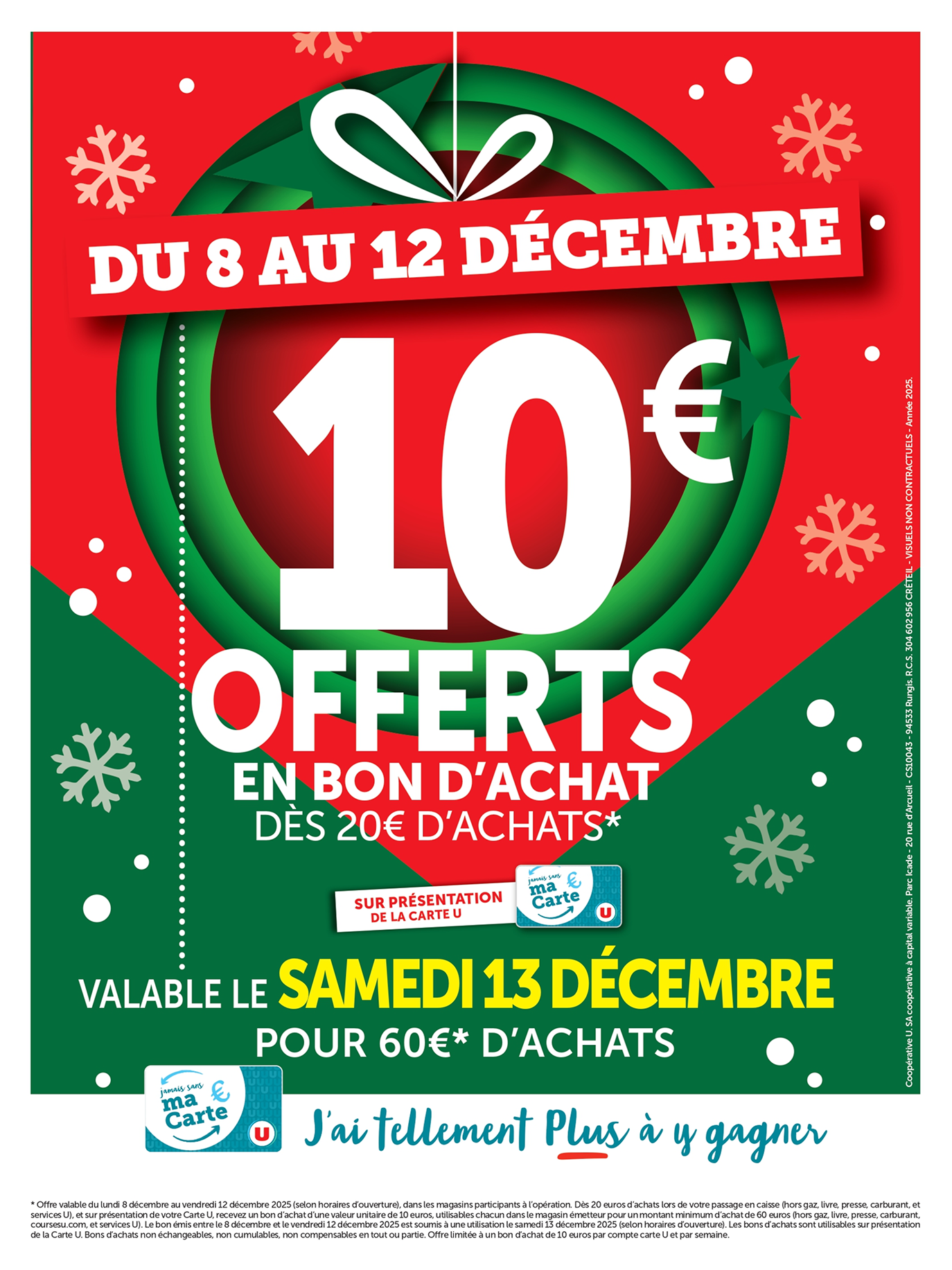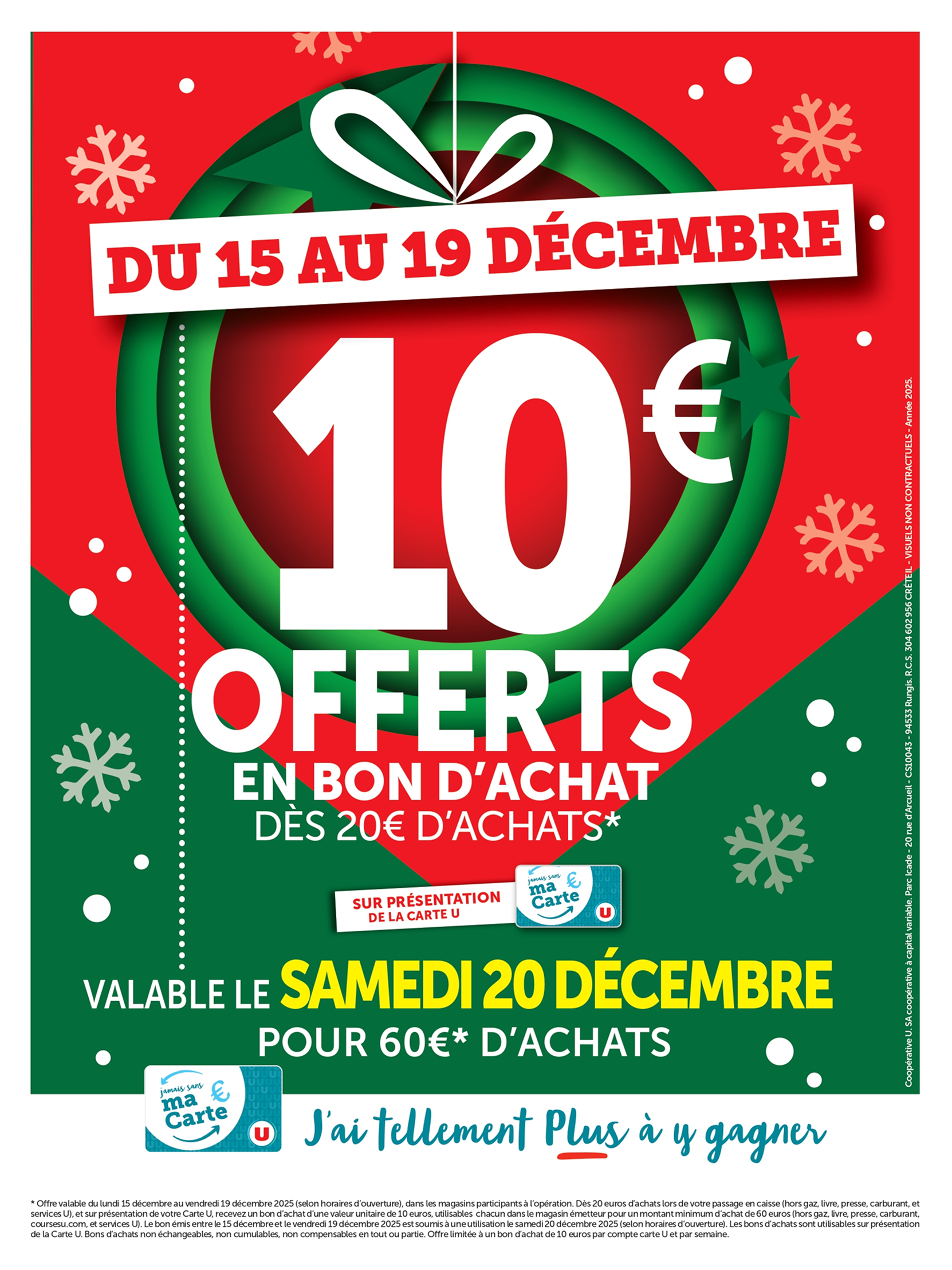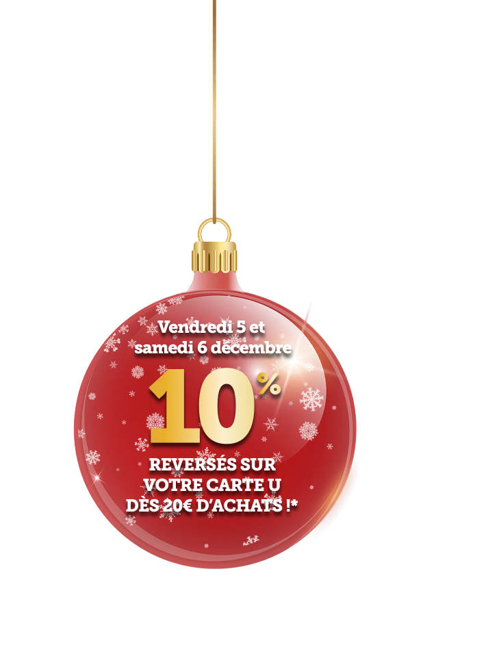 *Voir conditions en magasin. (1) Bon d’achat émis du 08 au 12/12 pour 20€ d’achats valable le samedi 13/12. (2) Bon d’achat émis du 15 au 19/12 pour 20€ d’achats valable le samedi 20/12. (3) Crédités en € carte U sur les achats du rayon mentionné et balisé en magasin