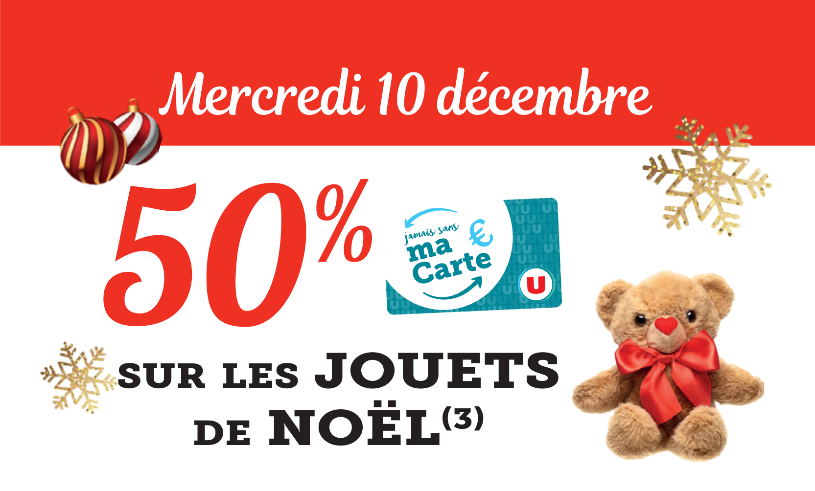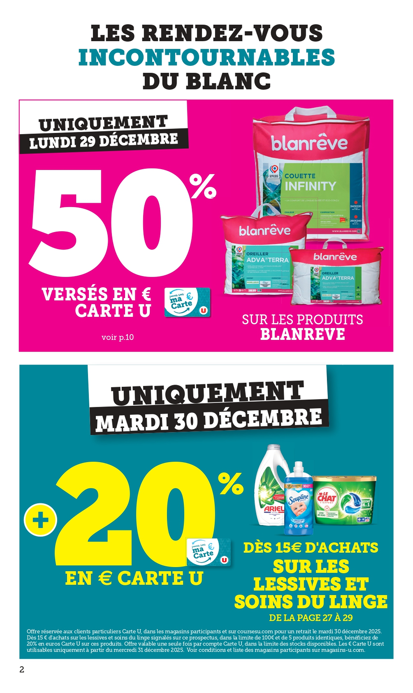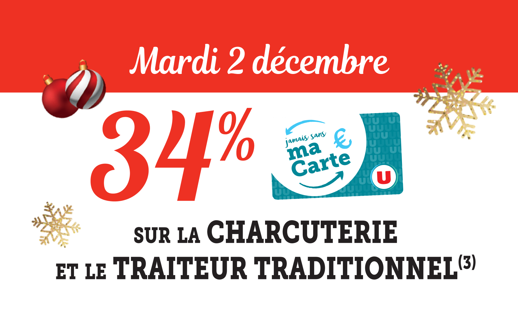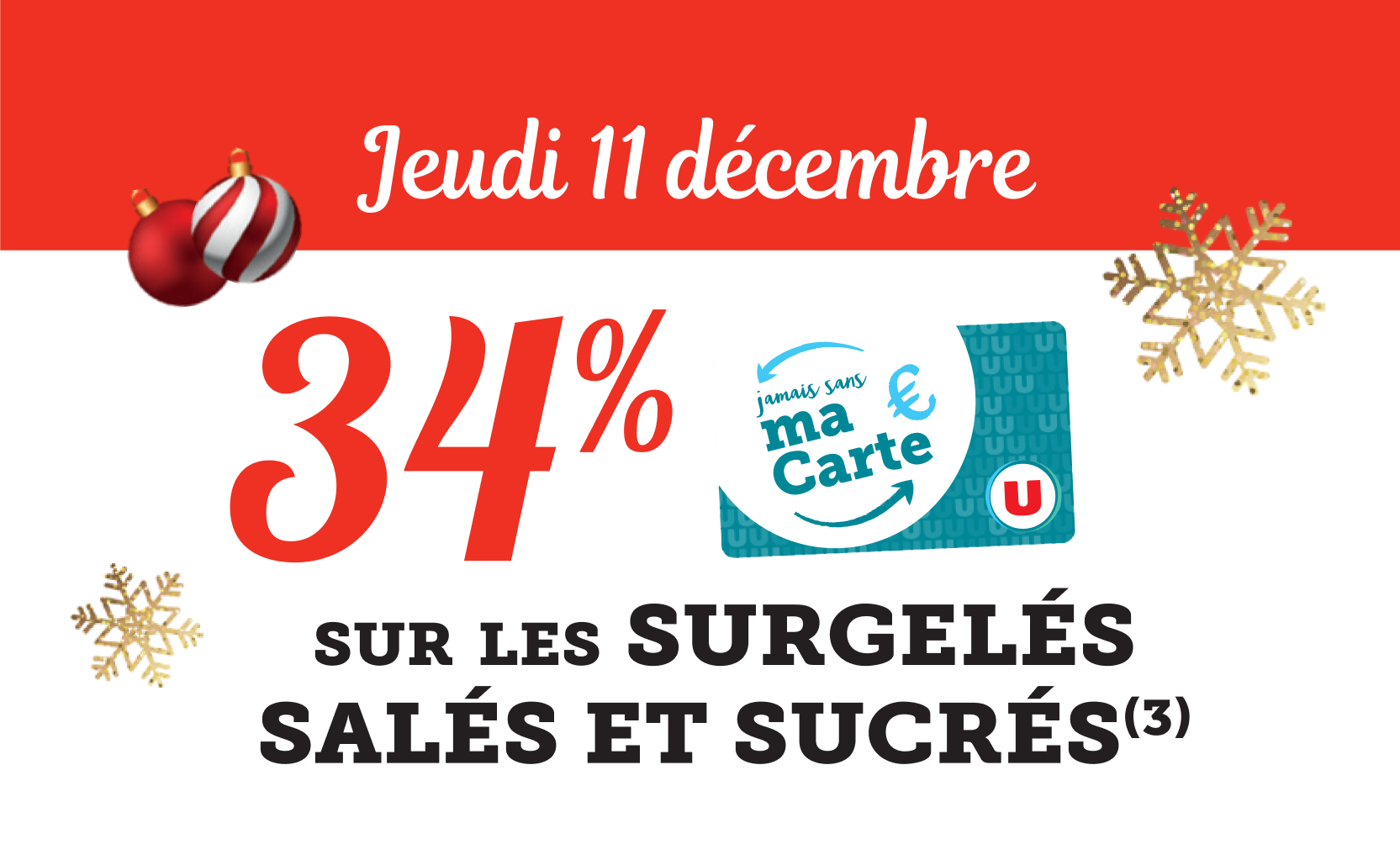 *Voir conditions en magasin. (1) Bon d’achat émis du 08 au 12/12 pour 20€ d’achats valable le samedi 13/12. (2) Bon d’achat émis du 15 au 19/12 pour 20€ d’achats valable le samedi 20/12. (3) Crédités en € carte U sur les achats du rayon mentionné et balisé en magasin