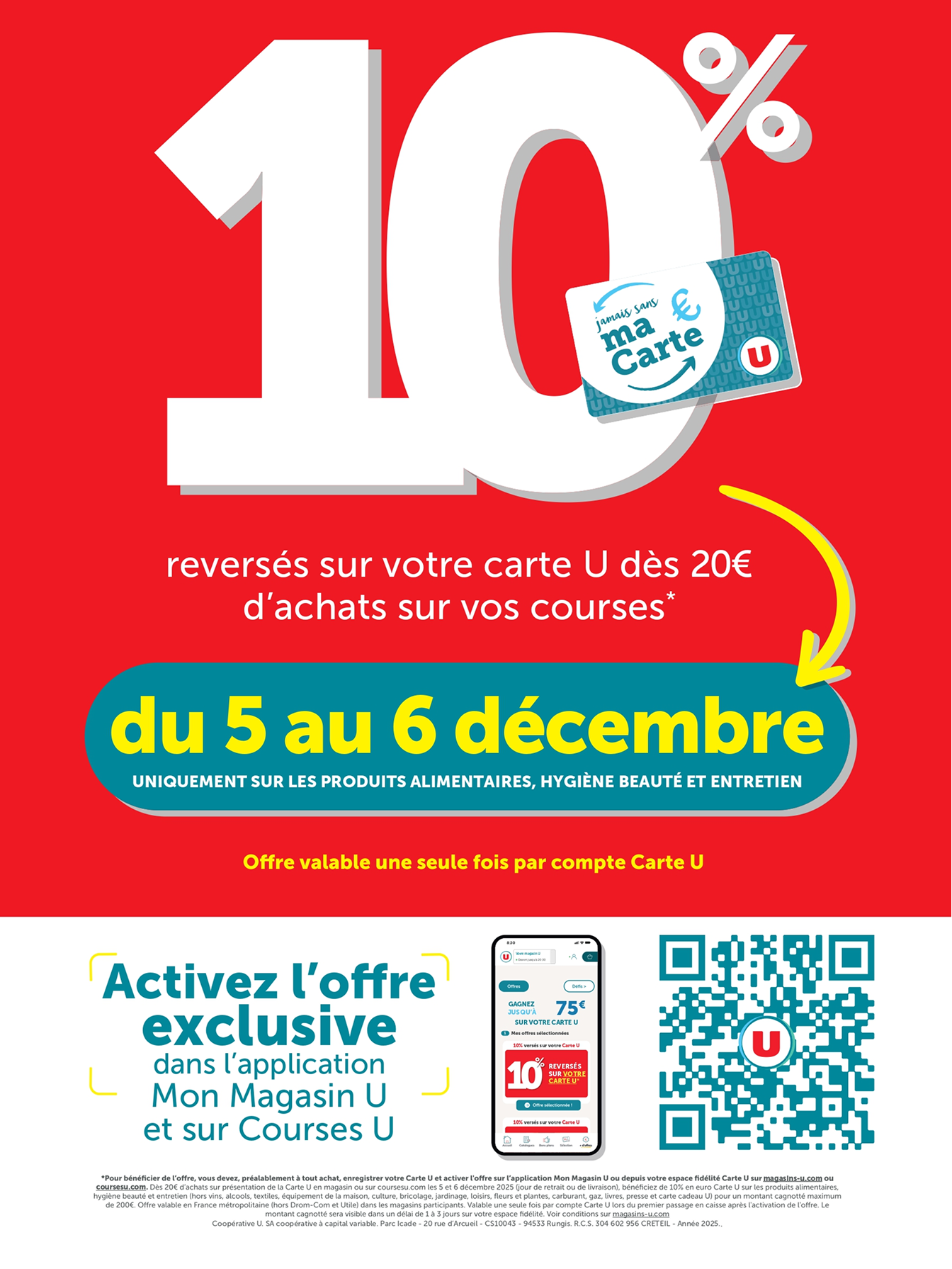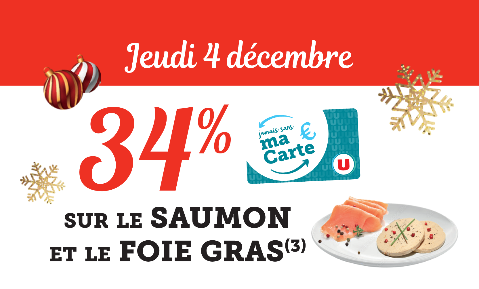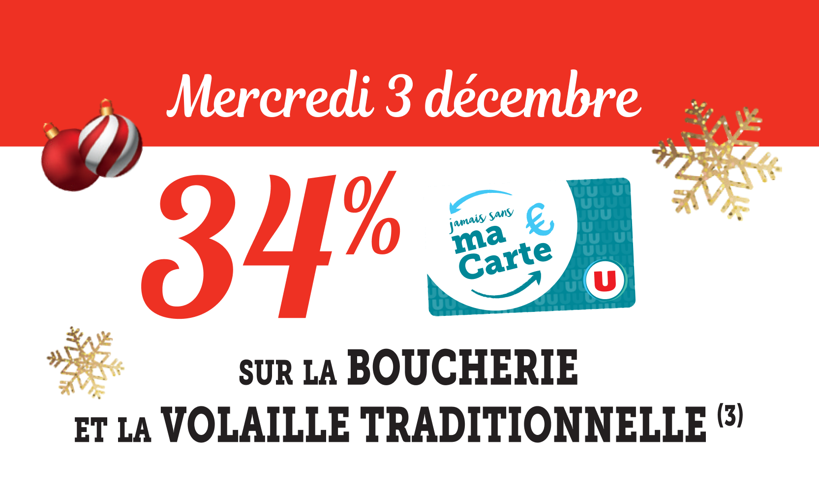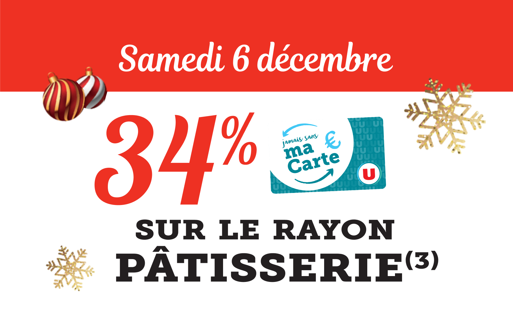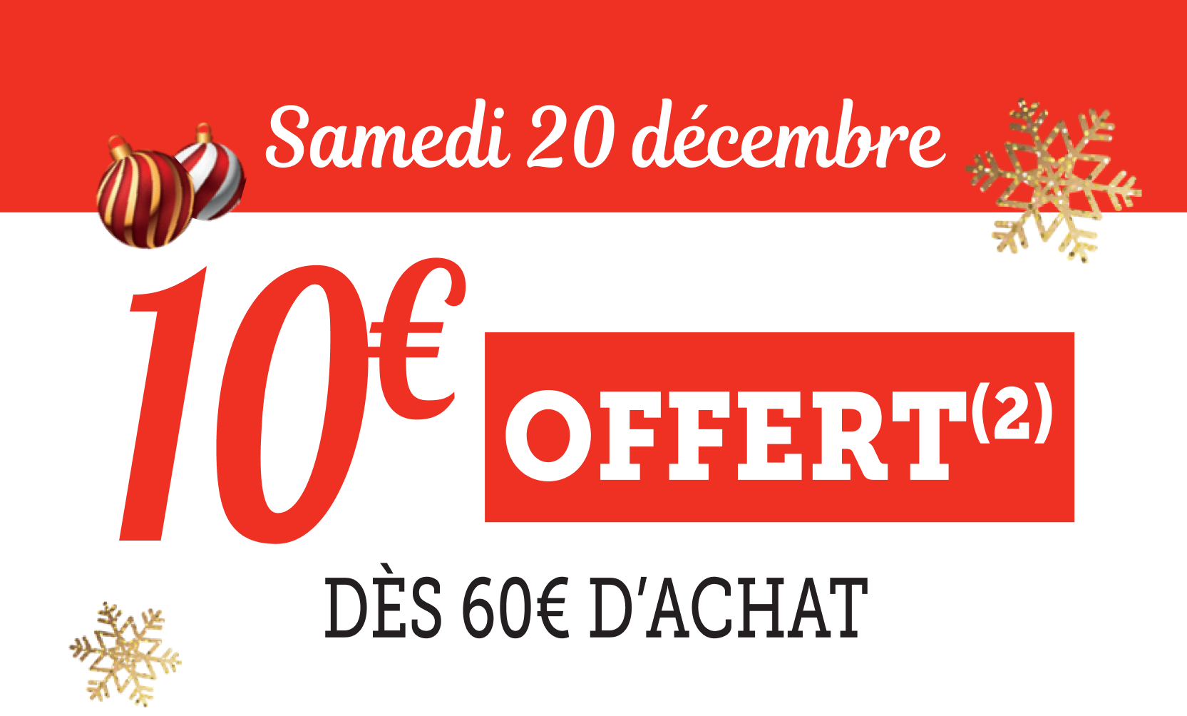 *Voir conditions en magasin. (1) Bon d’achat émis du 08 au 12/12 pour 20€ d’achats valable le samedi 13/12. (2) Bon d’achat émis du 15 au 19/12 pour 20€ d’achats valable le samedi 20/12. (3) Crédités en € carte U sur les achats du rayon mentionné et balisé en magasin