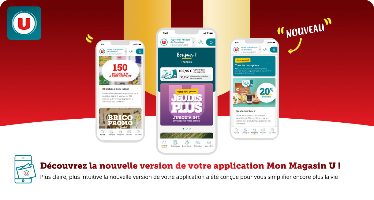 La Carte de fidélité U vous accompagne au quotidien pour vous faire bénéficier de nombreux avantages et d’offres personnalisées. Vos achats vous permettent de cumuler des € Carte U, que vous pouvez ensuite utiliser pour payer vos courses (en magasin et sur coursesu.com).